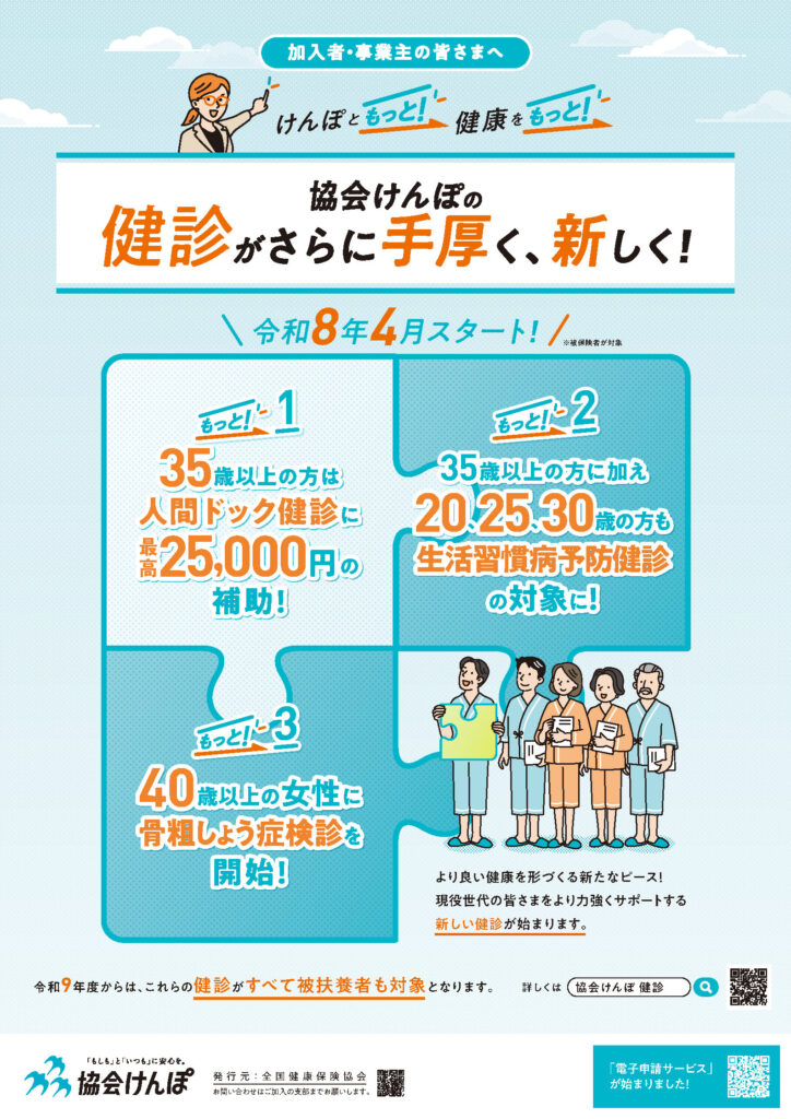 投稿日: 2026年4月27日2026年4月27日 投稿者: taishikai令和8年4月から「協会けんぽの健診がさらに手厚く、新しく!」なります 令和8年4月から「協会けんぽの健診がさらに手厚く、新しく!」なります
